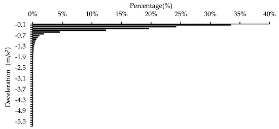 As can be seen from Figure 6, the distribution of deceleration was very concentrated. About 30.16% of the deceleration was between [−0.1, 0.0] m/s2, and about 95.10% of the acceleration was between [−1, 0] m/s2. The vehicle was moving at a constant speed with a small volatility. Only in rare cases does the driver make a significant deceleration.