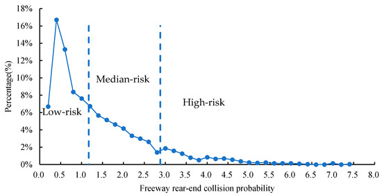 The sum of each vehicle’s rear-end collision probability is defined as the freeway rear-end collision risk (F-RCR) every 100 m in five minutes. That is to say, F-RCR represents the total value of the rear-end collision probability of all the vehicles on the road within a time range. The higher the F-RCR, the higher the rear-end risk. The lower the F-RCR, the lower rear-end risk. Converting the crash risk probability to the crash risk level can directly judge the status of a crash risk under the current traffic flow condition [34]. A reasonable F-RCR threshold was critical for the classification of high rear-end collision risk.