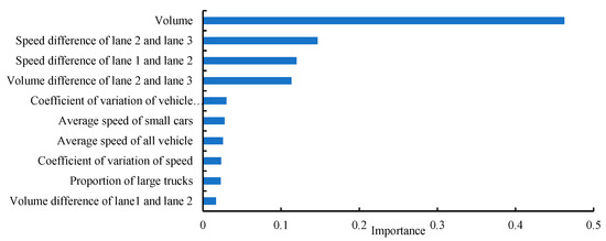 The second influencing factor was the speed difference between adjacent lanes, which mainly included the speed difference between lane 2 and lane 3, as well as the speed difference between lane 1 and lane 2. When the speed gap between adjacent lanes is large, drivers will change lanes to obtain a better driving environment. During the process of lane changing, there was always a large speed difference [29], which increased the likelihood of a collision. Shangguan [36] also found that speed difference was an important factor for the driving risk status which was consistent with the result of this research.