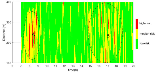 Figure 10 shows that it was low-risk status at most of the time. There has been a high-risk in section A and B, which time was from 7:00–9:00 a.m. and 15:00–19:00 p.m. In the morning peak hours, the traffic volume increased and the morning commute was very concentrated. It became low risk immediately after 9 a.m. for the working time was 9 o’clock. The section B can be regarded as evening peak hours and traffic volume increased. Compared with section A, the high-risk distribution in section B was more discrete. Larger volume variation between lanes will increase crash occurrence likelihood. This was consistent with previous studies that the crash rate would be increased when the volume increased [44] and larger volume variation between lanes [45].