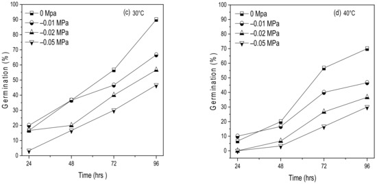 The G% decreased with a decrease in ψ from 0 to −0.01, −0.02, and −0.05 MPa compared with distilled water (0 MPa) by 93.3%, 76.7%, 46.7%, and 56.7%, respectively, i.e., the average for all levels of AAP. Similar findings were reported by previous studies that reported a longer accelerated aging period and lower ψ (more negative) decreased both G% and GR in various crops [8,9,12,37].