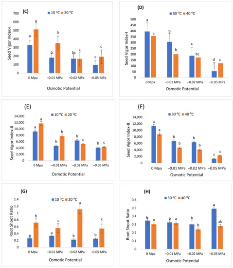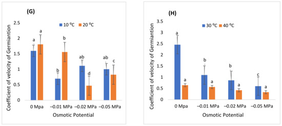 In addition, the highest mean germination time was recorded at 10 °C induced with −0.05 MPa, while the lowest at 30 °C induced with distilled water (Figure 2). Similarly, the MGR was determined as the reciprocal of MGT, and the CVG was noticed to be highest at 30 °C induced with distilled water (0 MPa). The highest CVt was observed at 30 °C at −0.01 and the minimum at 40 °C induced with distilled water. Moreover, Figure 4 illustrates that the highest and lowest GE, GRI, and TGI were observed at 20 °C in −0.01 MPa and 40 °C in −0.05 MPa, indicating that increasing T and ψ there would be a significant reduction in the growth phases of the germinating seed.