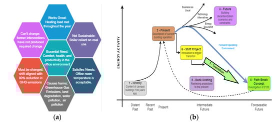 Following the wicked problem definition (Figure 1a), the essential need satisfied by the boiler heating is for the comfort, health, and productivity in the office environment. The heating system objectively works well, as the heating load can be met reliably throughout the year. The use of coal is not sustainable, and to meet the COP21 Paris Agreement requirements, coal use is required to be reduced by 80% [6]. The system meets the needs for heating, although because it is not thermostatically controlled, many spaces can become overheated as the penetrating solar energy has a significant impact on the heat fluxes through the surfaces of a building zone [35]. Overheating in cold seasons often happens in buildings, leading to excessive energy consumption [36,37,38]. Mining and burning coal cause harm including land degradation, acid mine drainage water pollution, and urban air pollution [39]. The current district heating system needs to shift as UC is committed to reducing 80% of the 2018 carbon emissions by 2023, as stated in the Low Carbon Energy Scheme Roadmap strategy [40]. However, after numerous studies and investigations, the alternatives and costs of changing the system have not produced the required change.