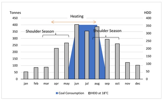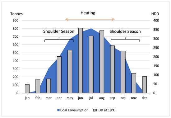 Heat for indoor space is an essential need. The lowest temperatures experienced in Christchurch are around −1.9 °C [32] overnight, in winter. The main UC campus, located in Ilam since 1975, is a 76-hectare site that features administrative buildings, libraries, lecture theatres, laboratories, and student accommodation and services buildings. The Boiler complex serves a pressurized hot water network with a Medium Temperature Hot Water (MTHW) 12 MW boiler and a 3.5 MW steam boiler. The boiler plant uses a blend of 50% lignite and 50% bituminous coal originally sourced by two local mines [33]. The heating load for the campus buildings is seasonal and the boilers are shifted according to weather conditions. The steam boiler is generally started up in the second term of the academic year in April. The MTHW boiler enters into operation when the heating load is raised. The district heating system operates until the end of the academic year in October. The Heating Degree Days (HDD) calculated for base temperature Tb = 18 °C [34] for campus buildings are shown in Figure 2. During the spring and fall (shoulder) seasons the temperature can fluctuate between 25 °C and 12 °C from one day to the next. There is no space heating required during the summer, but the nights are often cooler than the base temperature which produces HDD in the calculation. Domestic hot water also benefits from the MTHW system throughout the year, except during the December-January holidays.