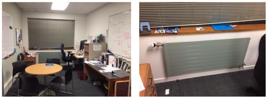 The university heating system uses medium temperature hot water (MTHW) that comes from a centralized coal-fired boiler, then is fed to 28 building blocks through the university district heating system. At present, heat is delivered around the campus to radiators that have manual thermostatic radiator valves (TRVs) for office spaces, as shown in Figure 4. During the shoulder seasons in spring and fall in Christchurch, New Zealand, the temperature varies over a week between warm and cool. Since the radiators in offices are manually controlled, during the shoulder season it is typical for overheating to occur when occupants turn them up on a cold day, but then have excess heat on the following warm days. Cold weather in Christchurch during shoulder seasons is nearly always occasioned with clouds, so the solar gain is minimal.