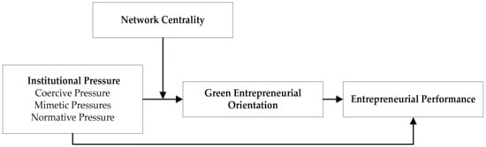 In entrepreneurial practice, however, the strategic orientation varies among new ventures despite being embedded in similar institutional environments. Social network theory states that all economic activities are embedded in the social network. The network position of an enterprise will affect its response to the external environment [5]. As a primary indicator used to measure an enterprise’s network position, network centrality reflects the centrality of the firm’s position or status in the network [18]. Perry pointed out that firms with high network centrality are more likely to access strategic resources with high quality [19]. In addition, such resources are crucial to the implementation of their strategic orientation. Tan’s research showed that focal firms can improve their competitiveness and establish new myths by making full use of network resources and engaging in institutional entrepreneurship [20]. In contrast, Westphal concludes that focal firms in the network tend to comply with institutional pressure due to their higher visibility and greater attention from stakeholders [21]. Such inconsistencies in prior studies point out the need to investigate the moderating role of network centrality that affects the relationships between institutional pressure and green entrepreneurial orientation.