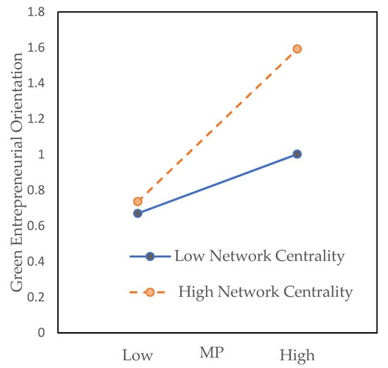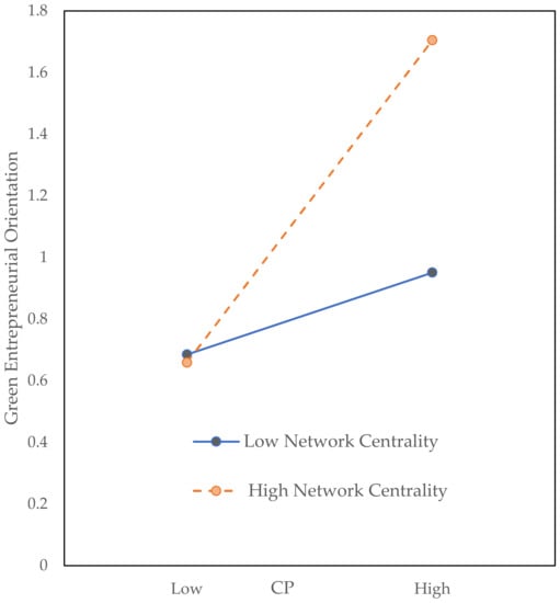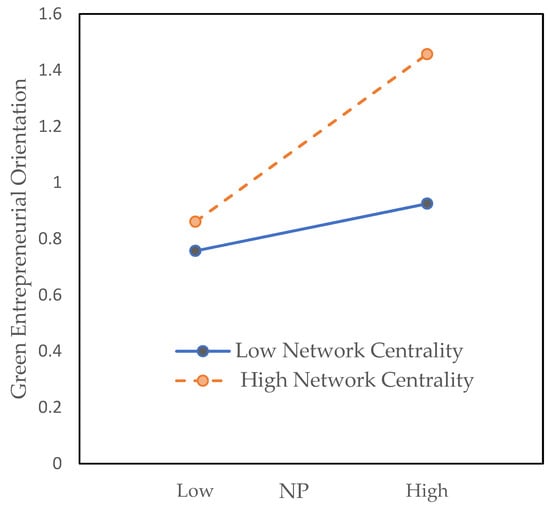Network centrality reflects the position of an organization in the network [103]. Prior studies have paid much attention to the relationship between network centrality and strategic orientation. Zhou contended that network centrality promotes the implementation of strategic orientation [104]. According to institutional theory, enterprises occupying a central position in a network have higher visibility and bear greater institutional pressure, so they are more inclined to comply with institutional pressure [46]. Stam suggested that new ventures that sustain a central network position have privileges in quickly identifying, accessing, and mobilizing external resources, which facilitates the implementation of entrepreneurial orientation [5]. Song [105] pointed out that occupying the central position in a network helps firms gather green innovation knowledge and develop innovative solutions to environmental challenges. Accordingly, we believe that network centrality has a positive moderating impact on the relationship between institutional pressure and green entrepreneurial orientation.