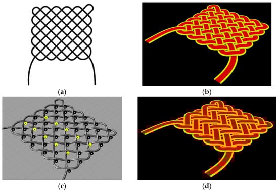 Figure 6. Free-woven structures created through interactive operation. (a) Original 2D sketch; (b) automatically built 3D model; (c) identifiers at the cross points (yellow points are selected to be flipped; (d) regenerated model according to the identifier selections.