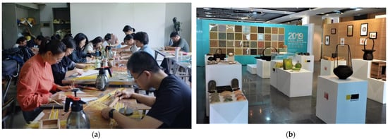 Figure 12. Bamboo woven ICH product design and making course and the resulting works. (a) Trainees at work; (b) the work of trainees on exhibit.