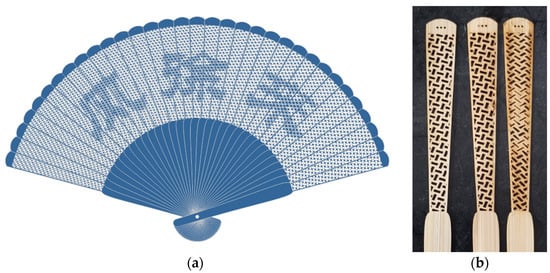 Figure 14. Interweaving pattern of a bamboo fan (The three Chinese characters hidden in it is the Brand of the product). (a) The design; (b) sample of bones.
