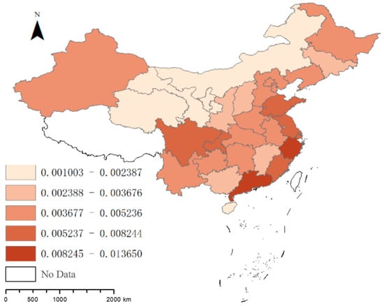 Figure 1 tells the spatial distribution characteristics of the average value of technological innovation efficiency in 2001–2017. In general, the efficiency of scientific and technological innovation shows a distribution trend of the low values in the northwest and the high values in the southeast.