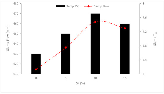 The slump flow test was based on the European SCC criteria, and the mixes with a flow diameter range of 600 mm and 800 mm were taken into consideration (EFNARC 2002) [38]. The slump flow and slump T50 of SCC with SF replacement are shown in Figure 2.