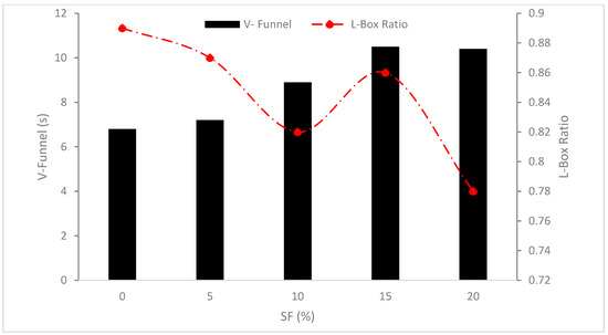 SF was added in varying binder concentrations of 5, 10, 15, 20, 25, and 30%, respectively. According to the findings, increasing the amount of SF in the mixes caused a decrease in the slump flow, while simultaneously increasing the amount of time the mixtures spent flowing through the V-funnel [45]. In contrast, the research said that the V-duration funnel steadily reduces with an increase in SF concentration, suggesting that this improves the vertical passage of fragments by reducing air bubbles that obstruct the vertical flow of the paste [49]. However, research [29] found that 5% SF results in an L-Box test ratio of 0.78, which is beyond the acceptable limit for SCC as stipulated by technical criteria, as shown in Figure 3. Although research [50] found that blocking ratios up to 0.60 had a high passing ability, the blocking ratio value in the L box test must be greater than 0.8 for the SCC to have a satisfactory passing ability, according to the technical standard [51].