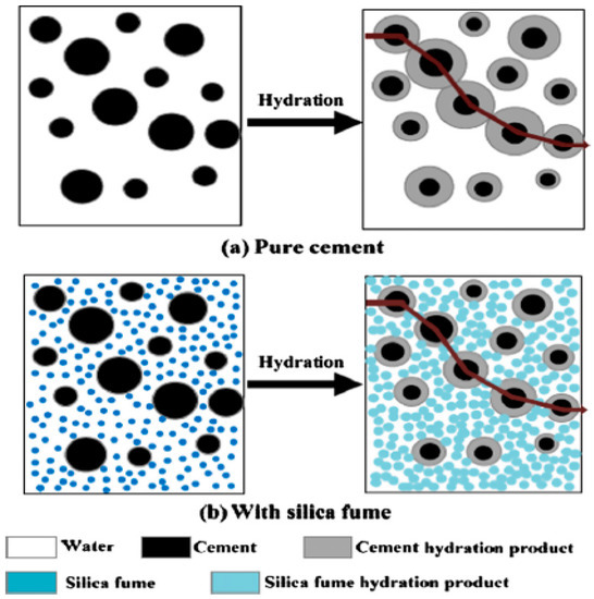 The most crucial component of concrete is the gap between cementitious and stone components, which also happens to be the weakest link in the chain and the key factor limiting strength and durability. The calcium silicate hydrate formed by the hydration process of the OPC nanostructure fills this space and boosts its strength and longevity. Due to its very large specific surface area, SF has a high degree of reactivity, which causes it to react with calcium hydroxide quickly and contributes to the creation of calcium silicate hydrate [84].
