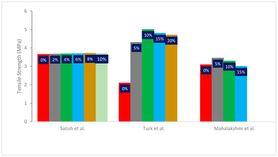 The splitting tensile capacity is improved by 27% with the addition of 5% SF to the reference concrete, and it lowers by 14% with the addition of 10% SF. Crumb rubber considerably lowers the concrete splitting tensile to roughly half of its control mixture [63]. The usage of metakaolin and SF had a large and modest impact on tensile strength, respectively. The increased compressive and tensile capacity was achieved by employing the recommended optimal proportion of replacement, 15% mixed pozzolan (7.5% metakaolin and 7.5% SF) [29]. The silicon carbide whiskers increased the cement-based materials’ tensile strength, and the ideal dose was 0.1% by weight [64].