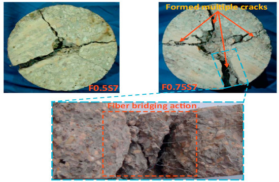 Figure 7 depicts the fracture patterns that developed on several test discs that were plain and reinforced with 0.75% recycled steel fiber. Due to enhancements at the interface of the aggregate-paste and fiber-matrix, and an improved fiber bridging action, the simultaneous use of SF and recycled steel fiber led to the formation of additional fractures on the specimens’ surfaces, as illustrated in Figure 7.