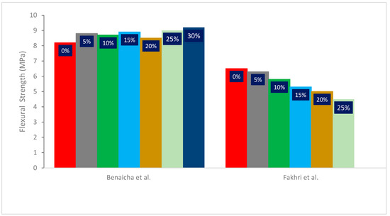 The FS of the SSC was decreased during the whole curing period when cement was partially substituted with SF. Due to a poor interfacial transition zone, the CS decreases when SF are partially substituted for cement. The application of SF has a poor transition zone that has a damaging impact on the strength qualities [56]. According to research, the compressive, flexural, and modulus of elasticity may all be increased by 10% of SF without negatively affecting any of the other properties by 29%, 22%, and 14%, respectively [69]. According to one study, using FA and SF increases concrete’s flexural capacity by 10%. The mixtures containing 5% of SF and 10% of FA had the best replacement percentage in terms of flexural capacity [70]. According to Fakhri et al. [71], adding rubber particles and SF to RCC at the same time boosts the concrete’s compressive and flexural capacity, decreases water absorption, and improves density [71].
