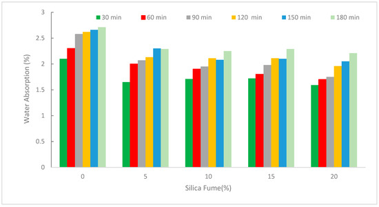 High water absorption values may affect concrete durability because water allows the majority of very corrosive elements to penetrate the concrete. The water absorption is shown in the image with various SF replacement ratios. Due to pozzolanic reaction and micro-void filling, concrete’s water absorption reduced when SF was substituted. Figure 9 depicts the water absorption of SCC with SF.