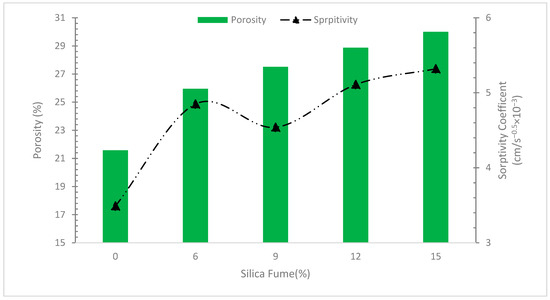 One of the often recognized extreme physical features of construction material is porosity, primarily because of its impact on crucial characteristics such as strength and durability. Figure 10 depicts the porosity and sorptivity with various SF replacement ratios. With the replacement of silica, concrete’s porosity and sorptivity increased. The greater water-to-binder ratio in binary mixes including SF, compared to other mixes and control specimens, may be the cause of the enhanced porosity [55].