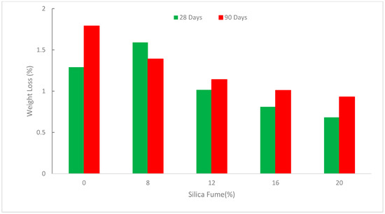 Figure 11 depicts how much weight concrete loses when exposed to chloride solution (NaCl). Loss of weight diminishes as the amount of SF replacement rises because SF improves the concrete’s pores, makes it denser, and makes it more resistant to chloride attack. According to research, adding 20% more SF to cement results in concrete that is far better resistant to chloride attack than conventional concrete because silica fume’s filler effects create small, discontinuous pore structures that improve microstructure [79].