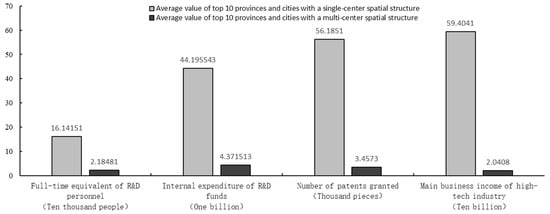 As shown in Figure 1, the technological innovation input or output of provinces and cities with a single-center spatial structure is much higher than that of those with a multi-center spatial structure. From the perspective of sci-tech innovation investment, the average full-time equivalent of R&D personnel and internal expenditure of R&D funds in the top 10 provinces and cities with a single-center spatial structure in 2020 are 7.39 and 10.11 times the average of those with a multi-center spatial structure, respectively. From the perspective of sci-tech innovation output, the average number of patent grants and the main business income of high-tech industries in the top 10 provinces and cities with a single-center spatial structure are 16.25 and 29.11 times the average of those with a multi-center spatial structure, respectively. This means that a single-center spatial structure tends to have more sci-tech innovation resources with greater density compared to a multi-center spatial structure, leading to a larger agglomeration effect and higher efficiency brought about by the shared division of labor and specialization in technology. A single-center spatial structure is conducive to strengthening sci-tech innovation strength. With the reallocation of innovation resources across the country, a single-center spatial structure will be more beneficial to absorbing high-quality innovation resources, thereby enhancing the strength of regional sci-tech innovation.