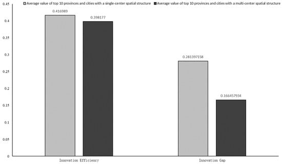 As presented in Figure 2, the innovation efficiency of regions with different spatial structures and the innovation gap between inner cities are different. Specifically, the two spatial structures are basically the same in the aspect of technological innovation efficiency. The average innovation efficiency of the top 10 provinces and cities with a single-center structure is slightly higher than that of those with a multi-center structure. This phenomenon further illustrates the agglomeration effect and scale effect brought by a single-center structure, which can promote the rational use of innovation resources, and thus better contribute to improving innovation efficiency. In terms of the innovation gap, the average innovation gap within provinces and cities with a multi-center structure is much smaller than that within those with a single-center structure. This result is basically in line with the cognition of the authors in this paper. That is, a multi-center spatial structure will promote the equal distribution of innovation resources, which is of use to the coordinated and balanced development of a region. Besides, the technological innovation network formed by a multi-center spatial structure can promote the flow of innovation elements to expedite the spillover effect of innovation, which is more conducive to narrowing the regional innovation gap.