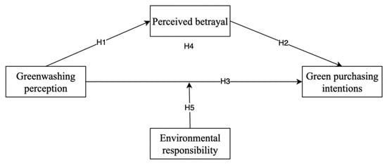 Based on the above hypothesis, this paper constructs a moderated mediation model in which environmental responsibility moderates the mediating role of consumers’ perceived betrayal in the relationship between greenwashing perception and their green purchasing intentions. Specifically, the stronger the consumer’s environmental responsibility, the more likely it is that consumers who perceive a company’s greenwashing behaviour will be less likely to purchase green due to perceived betrayal, and the stronger the mediating role of perceived betrayal. Therefore, the following hypothesis is proposed.