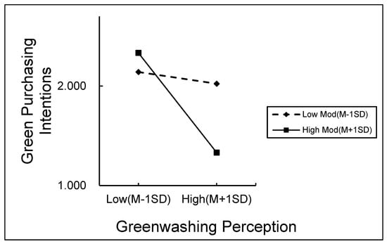 Finally, the paper introduces the sense of environmental responsibility to verify the moderating role of environmental responsibility in the relationship between greenwashing perception and green purchasing intentions and confirms that consumers with different levels of environmental responsibility have different degrees of influence on their green purchasing intentions when they perceive greenwashing behaviour [44]. The negative effect of greenwashing perception on green purchasing intentions is negatively moderated by consumers’ environmental responsibility [56], i.e., the stronger the consumer’s environmental responsibility, the stronger the effect of greenwashing perception on green purchasing intentions, and the weaker the opposite.