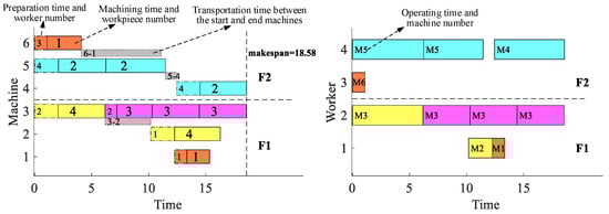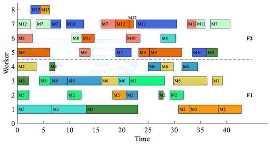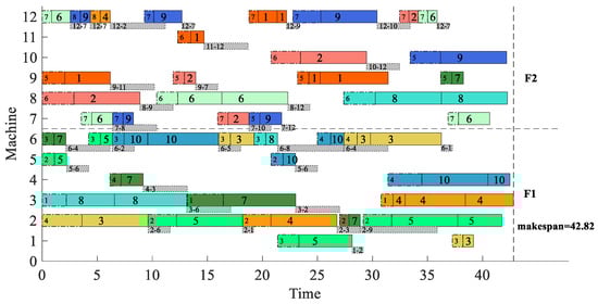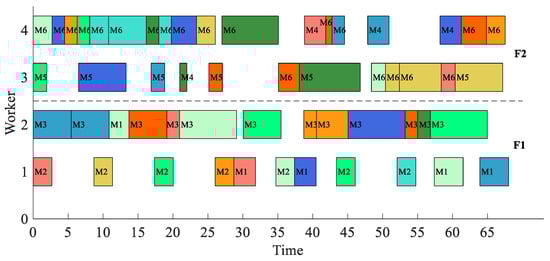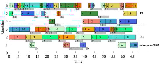 Considering the data in Table 1 as an example, the distribution of workers is and . The scheduling diagram of DFJSPD is shown in Figure 1, where each color represents a job in which order by time course is the process number.