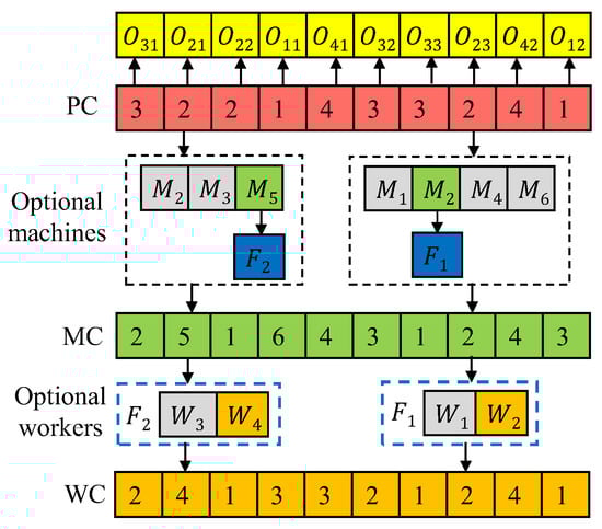In order to balance the global exploitation and local exploration in the early and late stages of the algorithm, the dynamic inertia weight is adopted [19], which linearly decreases with the number of iterations. After the mayfly position is updated, it is mapped to process code according to the discrete method in Section 3.2. The original worker–machine combination of each process is unchanged, and their positions are changed accordingly. After updating the position of mayfly corresponding to the process code in Figure 2, the three-layer codes after discrete mapping are as shown in Figure 5.