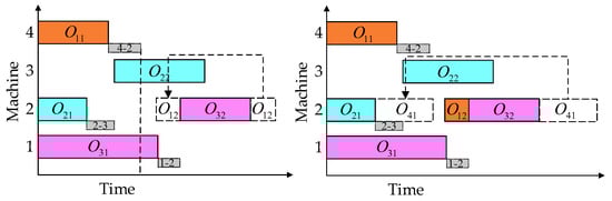 Therefore, this paper designs an active time window decoding algorithm considering transportation time for DFJSPD. The key is that when a process can be properly adjusted within the available idle time window, the start time is determined at the latest end time, and the larger idle time window is left as far as possible for subsequent processes, as shown in Figure 4. According to the process, transportation time, machine type, and flexible constraints of machine and worker in DFJSPD, as well as whether the preparation time and machining time of each process are affected, are judged and arranged in an appropriate idle time window. The steps of decoding are summarized by the pseudo code shown in Algorithm 2. The main steps are as follows: