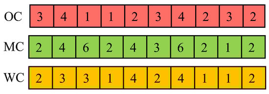 According to the problem characteristics of DFJSPD, each mayfly individual represents a solution that contains multiple information of process, factory, machine, and worker. This paper adopts a three-layer coding method: process coding (OC), machine coding (MC), and worker coding (WC). The three vector elements are in one-to-one correspondence, and the factory selection is reflected by machine coding. Considering the data in Table 1 as an example, the coding is shown in Figure 2. The three-layer codes are read from left to right at the same time. Each number in OC represents the workpiece number of the th occurrence in turn, and is the process number of the workpiece. The corresponding positions of MC and WC represent the machine that processes the process and the worker who operates the machine.