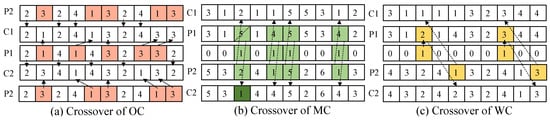 (a) The IPOX crossover operator is adopted on OC. (b) An improved IMPX crossover operator [26] is adopted on MC. If the machine is unavailable after exchanging, a machine with the shortest processing time is selected from the set of alternative machines for the corresponding process. (c) Since it is assumed that workers cannot transfer across factories, a two-point crossover operator considering factory constraint is designed for WC. For the parent P1, two crossover points are selected and exchanged respectively with any two workers in the same factory in the parent P2. If the worker after the exchange is unavailable, a worker with the highest efficiency is selected in the optional workers set for the corresponding machine. Three crossover operators are shown in Figure 6, where P represents the parent and C represents the offspring.