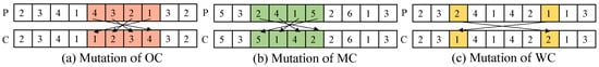 (a) Reverse sequence mutation is adopted on OC. The genes reverse sequence exchange between two different mutation sites randomly selected, and MC and WC are adjusted accordingly to keep the original worker–machine combination of each process unchanged. (b) The mutation rules on MC are the same as OC, and if the machine after mutating is unavailable, the worker–machine combination is reselected in the optional machines and workers set. (c) Two points of mutation are adopted on WC, that is, randomly selecting two different workers in a factory to exchange positions. If the worker after the exchange is unavailable, a worker with the highest efficiency is selected in the optional workers set for the corresponding machine. The three mutation operators are shown in Figure 7.
