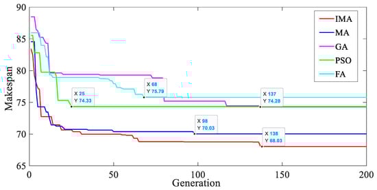 The convergence performance of the algorithm is analyzed by considering example DMk01. It can be seen from Figure 8 that the hybrid initialization strategy of IMA improves the quality of the initial population. The five algorithms can converge to their respective optimal solutions, but the convergence speed of GA and FA is slow and the solution accuracy is low, converging to 74.28 and 75.79, respectively. PSO has the fast convergence speed, but it is subject to premature converging to 74.33. The convergence speeds of IMA and MA are fast in the early stage, and the completion time converges to approximately 70 in the 30th generation. The wedding dance and random flight operations in the late iteration make the algorithm jump out of local optimum, but the accuracy of the crossover and mutation methods of MA is not high, converging to 70.03. The multiple crossover and mutation operators of IMA can expand the search range, and found the optimal solution at 68.03. Overall, the optimization ability and speed of IMA are better than other four algorithms.