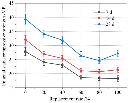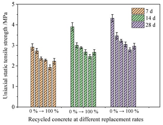- With the increase in curing age, the uniaxial compressive strength and splitting tensile strength of RC increase continuously. The compressive strength and splitting strength of RC show a decreasing trend with the increase in the RR of RCA. The reason was that the increase in the proportion of RCA increases the number of initial micro-cracks and damages in concrete.