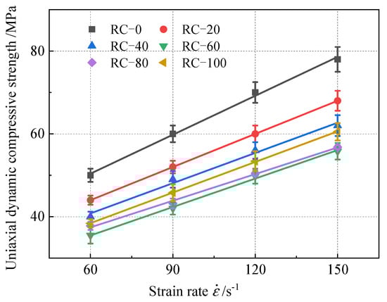 - Under impact load, the dynamic compressive strength of RC increases linearly with the increase in strain rate, showing an obvious strain rate enhancement effect. With the increase in the RR of RCA, the strain rate sensitivity of RC decreases gradually, but slightly increases when the RR is 100%.