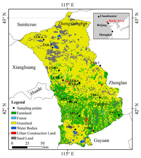 We collected 14 soil samples from 21 to 23 October 2018, with 7 sample plots each in Taipusi Banner and Zhengxiangbai Banner (Figure 1). There were 5 sample plots and 9 sample plots in cultivated land and grassland, respectively. On the other hand, 2 sample plots were in semi-shifting sandy land and 3 sample plots were in fixed sandy land.
