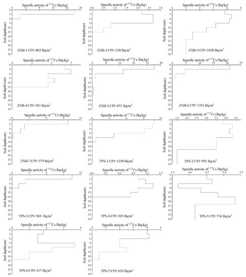 Overall, the distribution patterns of the 137Cs profiles at the sampling plots were closely related to their land-use characteristics. The 137Cs profile distribution at the sample plots located in grassland and sandy grassland (ZXB-1, ZXB-2, ZXB-4, ZXB-5, ZXB-6, ZXB-7, TPS-1, and TPS-3) usually showed a “single peak + negative exponential curve” profile distribution pattern. The peak 137Cs activity was generally found in the surface or subsurface layer (0–6 cm) of the soil, and the 137Cs specific activity decreased gradually with increasing soil depth. In the sample plots located on cultivated land (TPS-2 and TPS-4), 137Cs showed a uniform distribution pattern in the plow layer (0–20 cm), and the 137Cs specific activity did not change significantly with soil depth. At the sample plots located in fallow land (TPS-5, TPS-6 and TPS-7), the 137Cs specific activity was often influenced by a combination of anthropogenic and natural factors, and its profile distribution pattern was more complex, without any uniform and obvious pattern.