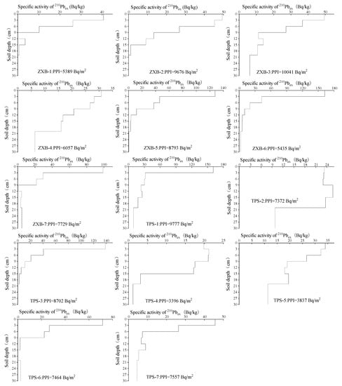 We investigated the profile distribution patterns of 210Pbex in the sample plots (Figure 3). In general, the maximum depth of 210Pbex in soil was generally higher than that of 137Cs in soil.