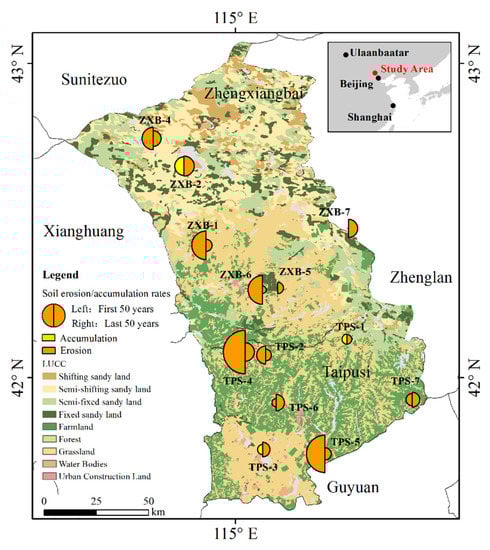 There are three plots (ZXB-2, TPS-1, and TPS-3) in the third category, where the soil process is converted from soil accumulation to erosion, and the erosion modulus was higher than that of the accumulation process. In terms of spatial distribution, the above sample plots are mainly distributed in the semi-shifting sandy areas in the northern region, cultivated land, and grassland of the southern area. This indicates that these sample plots have undergone a more complex soil erosion or accumulation process.