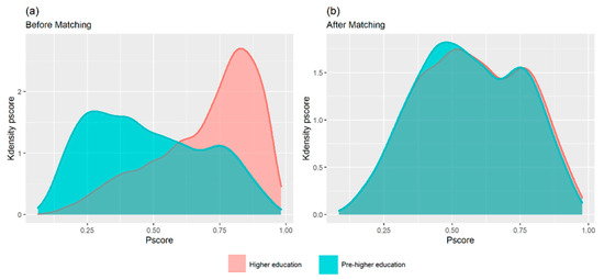 The propensity scores were estimated by a logit model using both determinants of HE and factors that affect HL (Table A2 in Appendix A). Before PSM, significant differences were found in all the covariates except for ethnicity between two groups (p < 0.05). After PSM, no statistical differences were found in any of the covariates (p > 0.05). Standardized mean difference (SMD) is the most commonly used statistic to examine the balance of covariate distribution between treated and control groups. In this study, SMD is reported as less than 0.1 (Table A3 in Appendix A), which indicates the covariates predicting propensity scores are balanced [49]. It can also be confirmed in the distribution of K-density between the higher education and the pre-higher education group before and after matching (Figure 1).