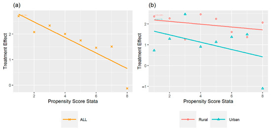 Heterogeneous treatment effects: (a) total sample; (b) urban and rural subsamples. Note: Graphics created by ggplot2 in R. https://cran.r-project.org/web/packages/ggplot2/index.html (accessed on 20 June 2022).