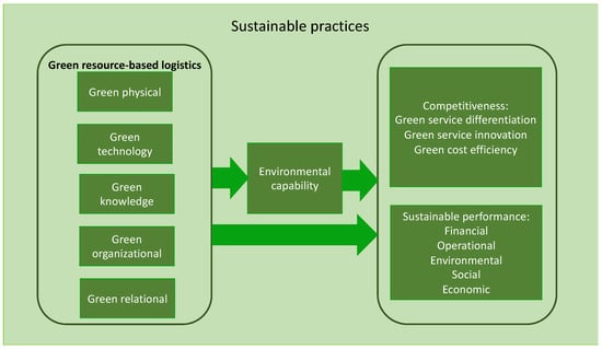 Sustainability research is still a young discipline, particularly in the logistics industry and does not have a theory; hence, approaches from other fields are used []. Based on reviews, this study conceptualizes green and sustainable logistics practices into five emergent green resource-based logistics capability constructs to create environmental value to ascertain more positive impacts on green products/processes/services, profits, people, and the planet (4Ps) []. These new capability constructs, physical, technological, knowledge-based, relational, and organizational, are more conducive to enhancing environmental capability, directly impacting sustainability and competitiveness than green practice constructs (Figure 1). Unlike previous scholars, this study constructs sustainable practices from a resource capability perspective instead of based on practices or resource ownership. In other words, the sustainable practices of LSPs minimize environmental harm while delivering green goods, services, and information right from the point of origin to the end of need/consumption and back to the source again in a closed-loop system of reverse logistics []. Still, green resource-based logistics capability can increase environmental capability, perhaps explaining why such constructs have a significant positive impact and why they can lead to specific effects on sustained the environment and competitiveness.