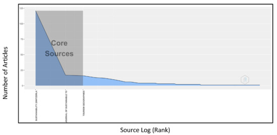 Bradford’s Law [48] was employed to explore the publication of documents across different journals [42]. Bradford’s law is a law of diminishing returns and scattering [49] which assumes that the number of journals in the intermediate and smaller zone will be n and n2 times larger than the core zone, respectively [50]. As illustrated in Figure 3, it was possible to substantiate the existence of these three zones. The nucleus or core zone comprises three journals, namely Sustainability, Journal of Sustainable Tourism, and Tourism Geographies, which published a total of 154 documents (35%). The three journals in the nucleus account for 1481 citations, representing 49.61% of total citations. Meanwhile, there are 37 journals in the intermediate zone and 140 journals in the smaller zone that were found to publish 141 documents (32.04%) and 145 documents (32.96%), respectively. Table 2 presents the impact of the sources by h-index. These sources are sequenced in the descending order of their h-index because “…h-index is a better citation-based metric for evaluating the quality and contribution of scholarly journals than other metrics such as the impact factor (IF) or the cites per paper (CPP)” [51] (p. 240).
