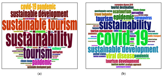 The 440 documents were assigned by 1640 authors’ keywords (DE) and 1321 keywords plus (ID). Authors’ keywords are provided by authors themselves, while keywords plus are the words that pop up frequently in titles of article’s references and are generated through an automatic computer algorithm [52]. Keywords are commonly used in bibliometric studies to effectively analyze the documents’ content, trend topics, and research hotspots of a given field [53]. The keyword “COVID-19” was the pinnacle, with 179 authors’ keywords (DE) occurrences and 131 keywords plus (ID) occurrences, followed by the keywords “sustainability” (70 DE and 80 ID), “sustainable tourism” (54 DE), and “sustainable development” (59 ID). Other frequently occurring keywords include “ecotourism”, “travel behavior”, “perception”, “strategic approach”, “climate change”, “carbon footprint”, “public transport”, “resilience”, “overtourism”, “sustainable development goals (SDGs)”, “new normal”, “competitiveness”, “responsible tourism”, and “active travel”. Figure 4 displays the word clouds of the top 50 authors’ keywords and keywords plus to swiftly scrutinize and compare the prominent terms in the field of tourism sustainability research amid COVID-19. A network of keywords shown in Figure 5 classifies the keywords into five different clusters. Cluster-wise dominant keywords are “COVID-19” (blue cluster), “sustainability” (yellow cluster), “sustainable development” (green cluster), “pandemic” (red cluster), and “public health” (purple cluster). The network also signifies that competitiveness, safety, innovations, sustainable mobility, crises management, governance approach, sustainable development goals (SDGs), carbon footprints, environmental protection, overtourism, virtual reality, and sustainable tourism development are some of the prominent areas where research opportunities are arising.