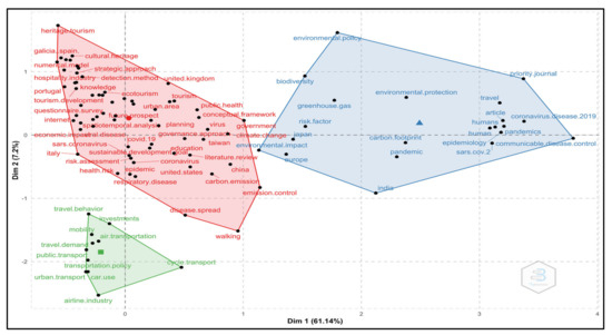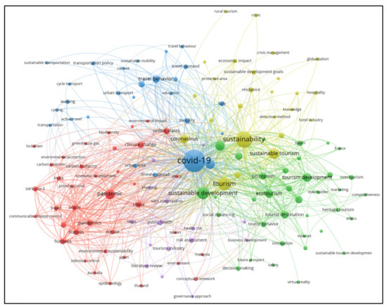 Cluster 1 (red cluster) covers a wide range of keywords, such as “COVID-19”, “risk assessment”, “public health”, “disease spread”, “governance approach”, “strategic approach”, “planning”, “sustainable development”, “emission control”, “sustainable development goals”, “spatiotemporal analysis”, etc. These terms are related to the management and sustainable development of tourism (for example, see References [60,62,63,65]). Cluster 2 (blue cluster) includes terms such as “environmental protection”, “biodiversity”, “greenhouse gas”, “carbon footprints”, “pandemic”, etc. These keywords are related to environmental health (for example, see References [68,73,74,75]). Cluster 3 (green cluster) presents terms such as “cycle transport”, “car use”, “transportation policy”, “public transport”, “travel behavior”, etc. These keywords are related to mobility trends (for example, see References [76,77,78,79]).