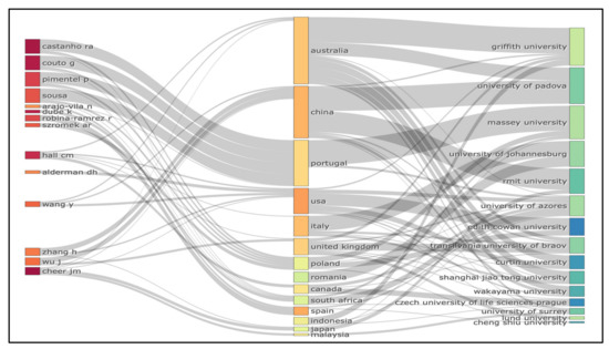 Three-field plot of author, countries, and affiliations. Source: own elaboration. Note: left field—authors; middle field—countries; and right field—affiliations.