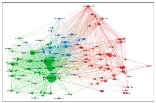 The intellectual structure of knowledge is assessed to determine the influence of authors’ work in the scientific community [70]. Co-citation analysis is the most widely used technique in bibliometrics to reveal intellectual linkages [79]. Co-citation analysis helps to identify the pairs of documents that are cited together in the third document [25]. It assumes that the publications which are often cited together are thematically similar [80] and thus concentrated in a cluster of visualization map [81]. The 440 documents analyzed in the present study have a total of 27,116 references. Figure 9 shows the three clusters of the relationship between the authors in bibliographic references. Based on total citations and academic linkages, the most prominent authors in Cluster 1 (red) include Han, H.; Wang, Y.; and Li, Y. Their documents were related to “travel trends amid COVID-19” (see References [82,83,84]). In Cluster 2 (green), Gossling, S.; Hall, C.M.; Scott, D.; Higgins-Desbiolles, F.; Cheer, J.M.; and Higham, J., are among the most prolific authors. Their documents are related to “transformative opportunities for sustainability” (see References [13,43,59,85]). In Cluster 3 (Blue), Sigala, M.; Dolnicar, S.; and Xiang, Z., are among the key authors. These documents are related to “COVID-19 impacts and tourism response” (see References [16,86,87]).