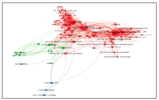 In Figure 10, we present a co-citation network of different journals that published documents on COVID-19 and tourism sustainability. There are three clusters identified by red, green, and blue colors. Journals in each cluster are generally co-cited. The journals with the most significant impact are Sustainability and Journal of Sustainable Tourism (red cluster); Tourism Geographies (green cluster); and Transport Policy (blue cluster).